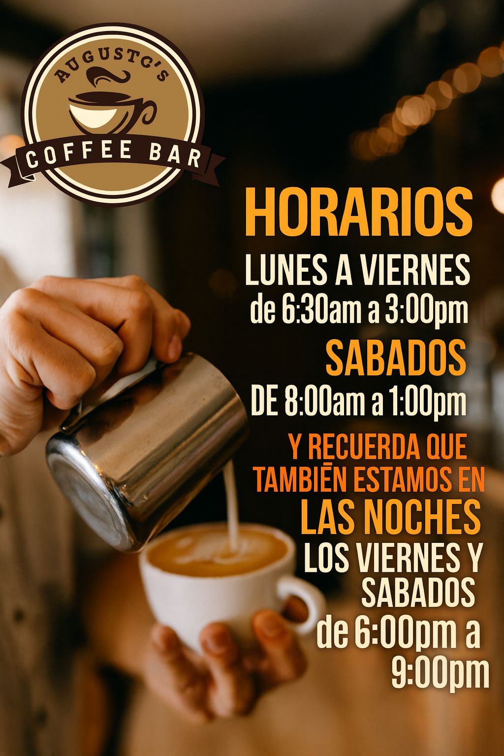 Ya sea que busques un lugar acogedor para comenzar tu día, una reunión informal de negocios, o celebrar un evento especial, Augusto’s Coffee Bar es el lugar perfecto. Ven y descubre por qué cada visita a Augusto’s es una nueva historia que te espera ser descubierta. pregunta por nuestro Programa de Rewards.